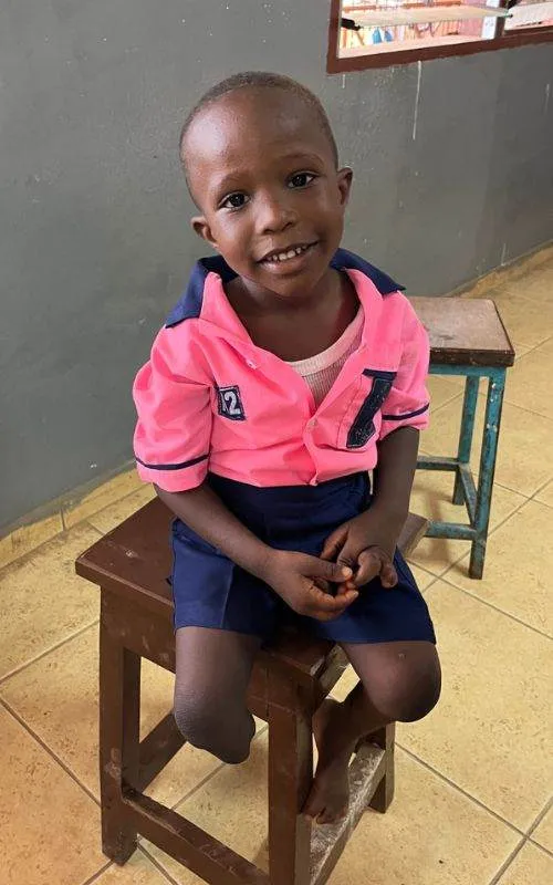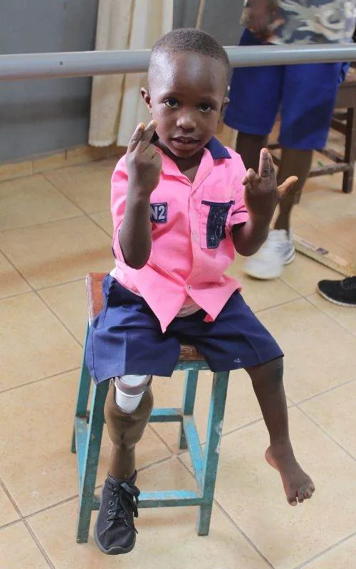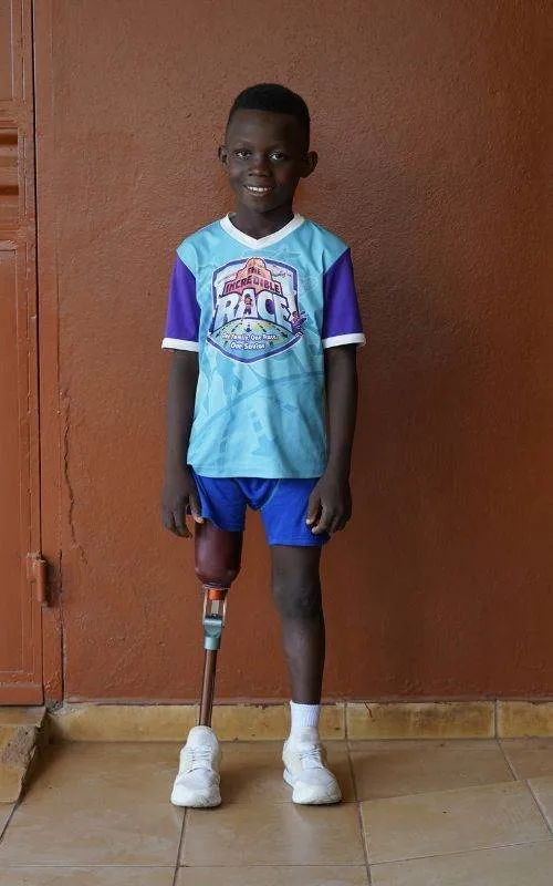 Bashiru ha 8 anni e vive a Bo, in Sierra Leone, con la sua famiglia. È amutato sopra il ginocchio a causa di una malattia congenita.